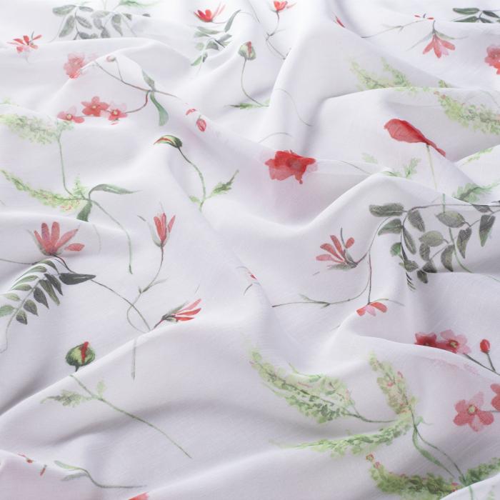 Die Gardine ist weiß-bunt floral bedruckt und für Fensterdekorationen, sowie für Flächenvorhang geeignet.